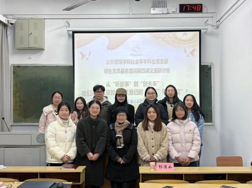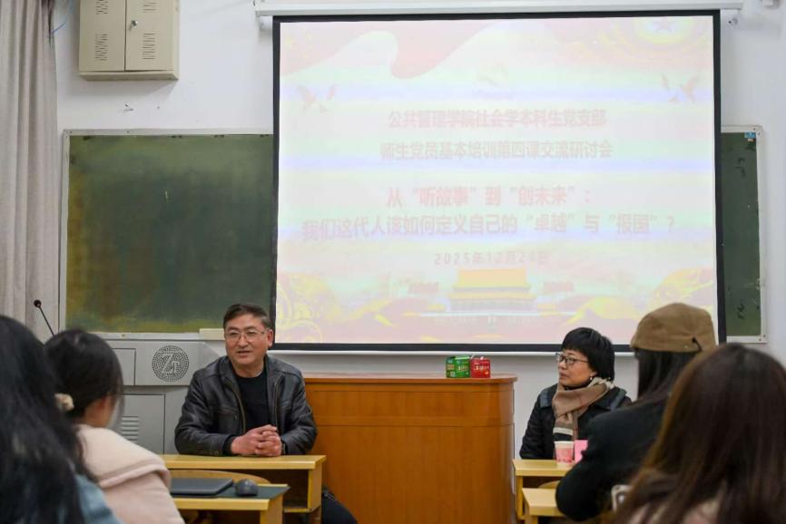 课后,师生党员基本培训第四课交流研讨会随即在世纪楼B401召开。公共管理学院党委副书记耿贵斌、铁道校区党工委书记彭满如、社会学本科生党支部书记梁慧出席研讨会,与党员们围绕“从‘听故事’到‘创未来’:我们这代人该如何定义自己的‘卓越’与‘报国’?”主题展开深入研讨。