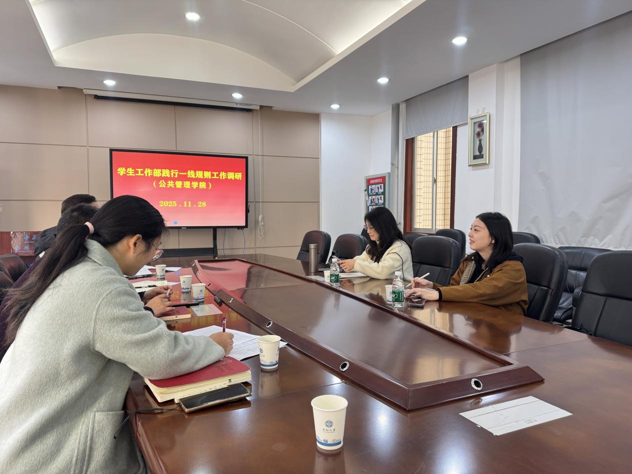 11月28日上午,校党委学生工作部就业指导中心主任徐赞一行莅临公共管理学院209室,围绕“践行一线规则”,及就业指导与服务工作开展专题调研。学院党委副书记耿贵斌及学工办全体辅导员参加调研会。