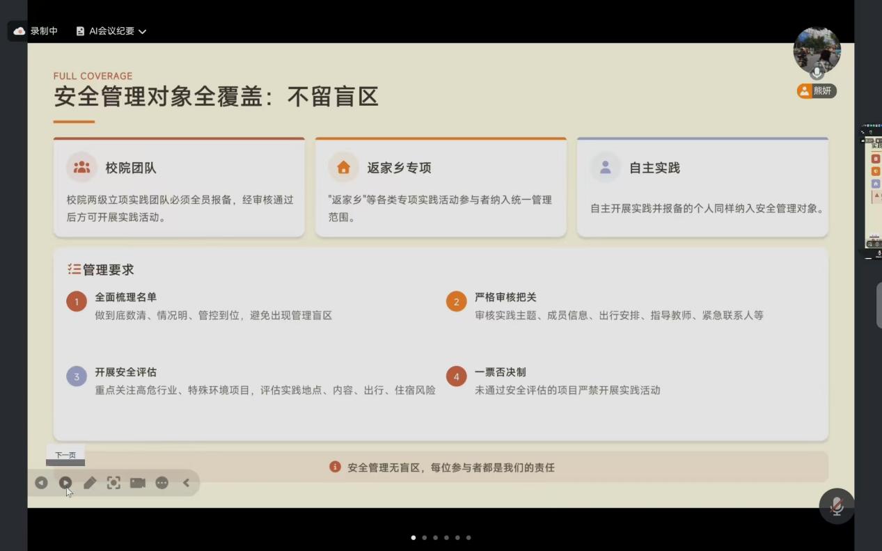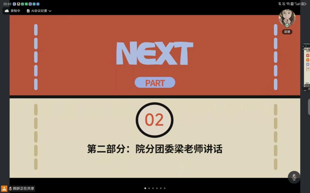 2月3日晚8时,为进一步加强寒假“返家乡”社会实践安全管理,提升学生安全防范意识与应急处置能力,我院线上召开“2026年寒假社会实践安全培训会”。院分团委书记梁慧、学院分团委科实部成员及全体参与寒假社会实践的学生参会,科实部熊妍担任主持人。