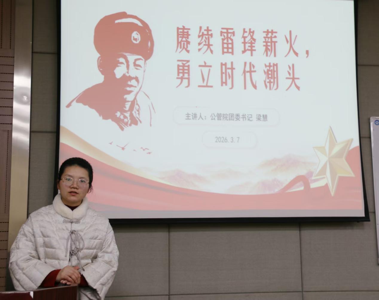 随后,学院团委书记梁慧以“赓续雷锋薪火,勇立时代潮头”为主题讲授团课,深入阐释雷锋精神的时代内涵,号召团支书带领团员积极参与梅岭社区、楠竹社区等志愿服务活动,以实际行动践行青年担当。