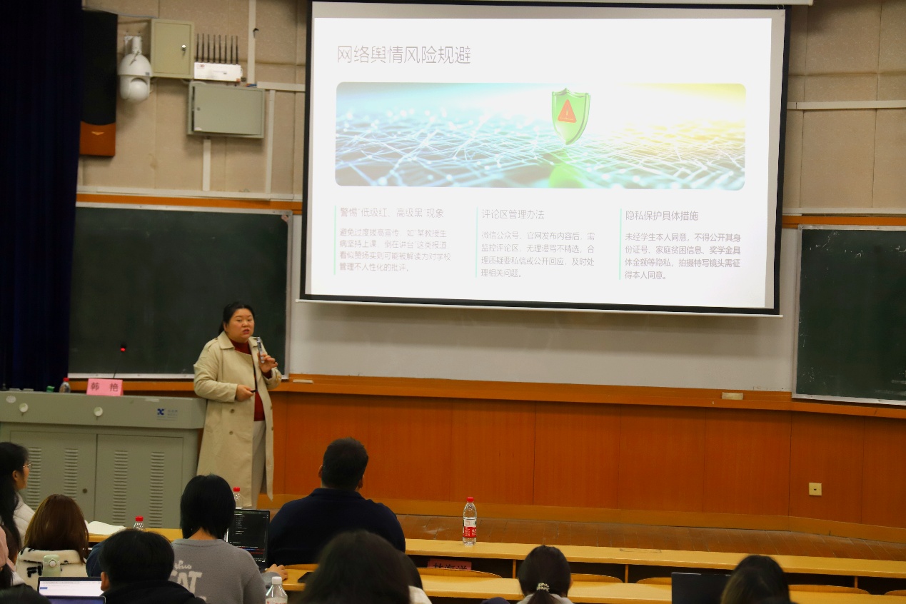 培训中,韩艳老师结合高校宣传工作实际,系统阐述了意识形态工作的政治属性与底线思维。她指出,高校是思想交锋的前沿阵地,团学干部作为青年思想的引领者,必须时刻绷紧“政治弦”。针对宣传工作中常见的表述问题,她系统讲解了宣传规范及相关准则,强调须严格履行审核程序,杜绝各类不当现象。