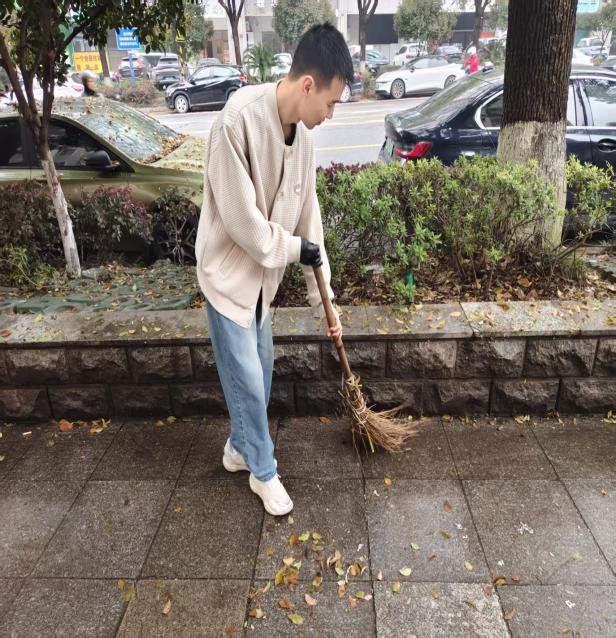 清理过程中,同学们分工协作、配合默契。团支书带头俯身捡拾路面垃圾,其余同学分别负责清扫落叶、清理绿化带杂物、规整路边非机动车等任务。大家以饱满的热情投入劳动,用双手还原街巷的整洁有序。