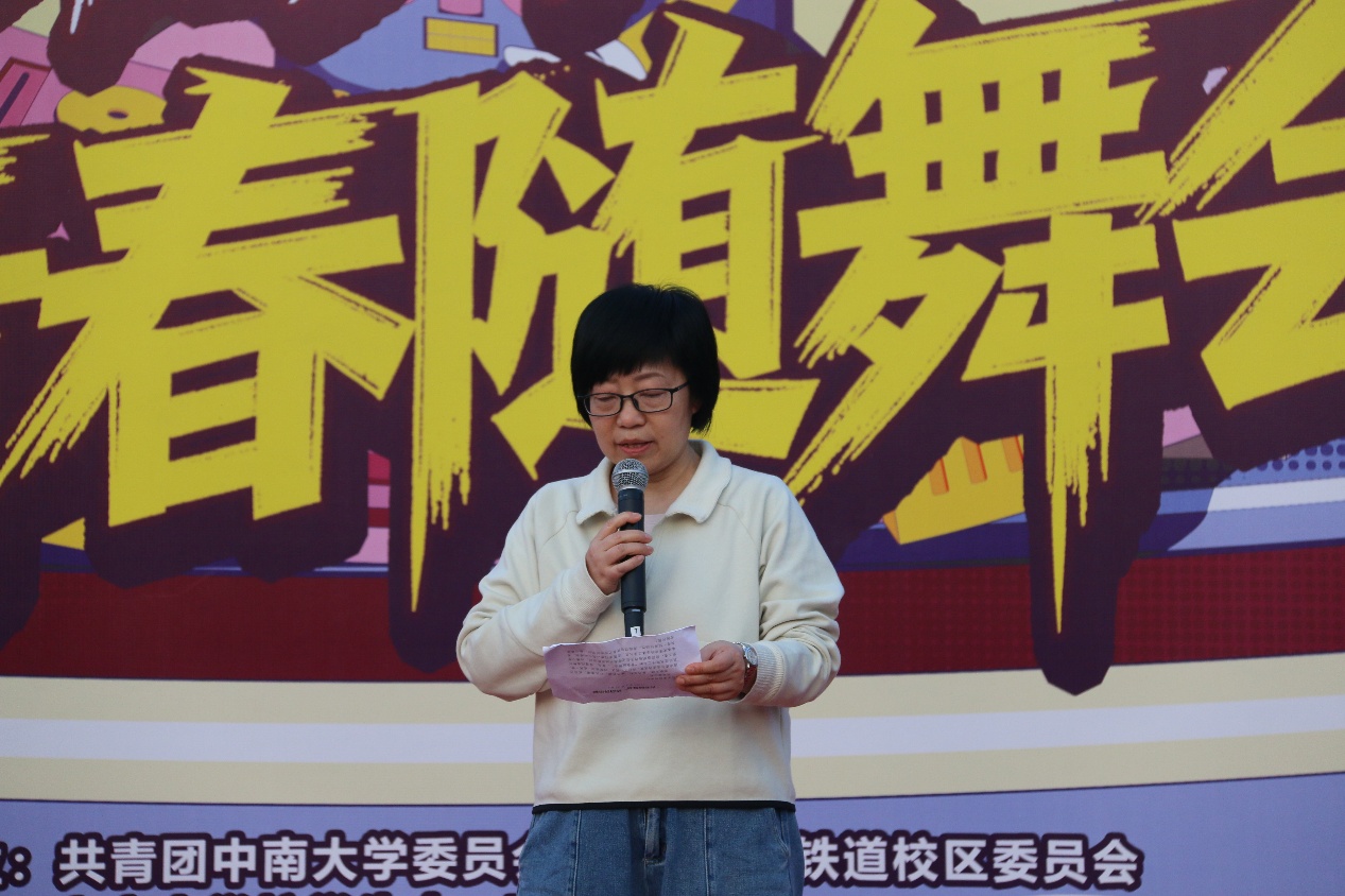 活动伊始,由中南大学铁道校区管委会党工委书记彭满如致开场词。随后,主持人介绍活动主题与流程安排。在工作人员的引导下,四院学生按学院分区列队就位,活动正式拉开序幕。四院10名领舞分两组从舞台两侧登台,教授全体同学标志性舞蹈动作,并带领全场齐跳《你要跳舞吗》,迅速点燃现场气氛。